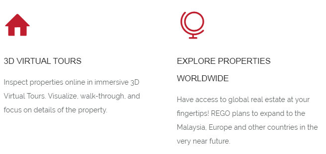 Service REGO will solve many problems that face real estate market participants. Using the platform, it will be possible to significantly simplify the order of the transactions conducted through smart contracts. REGO tokens will bind the buyer and the seller. The REGO platform will be available to users on various devices (iOS, Android, and also the Web). The activities of the REGO service are now carried out in the United States of America. In the future, it is planned to enter the market of Malaysia, Australia.
